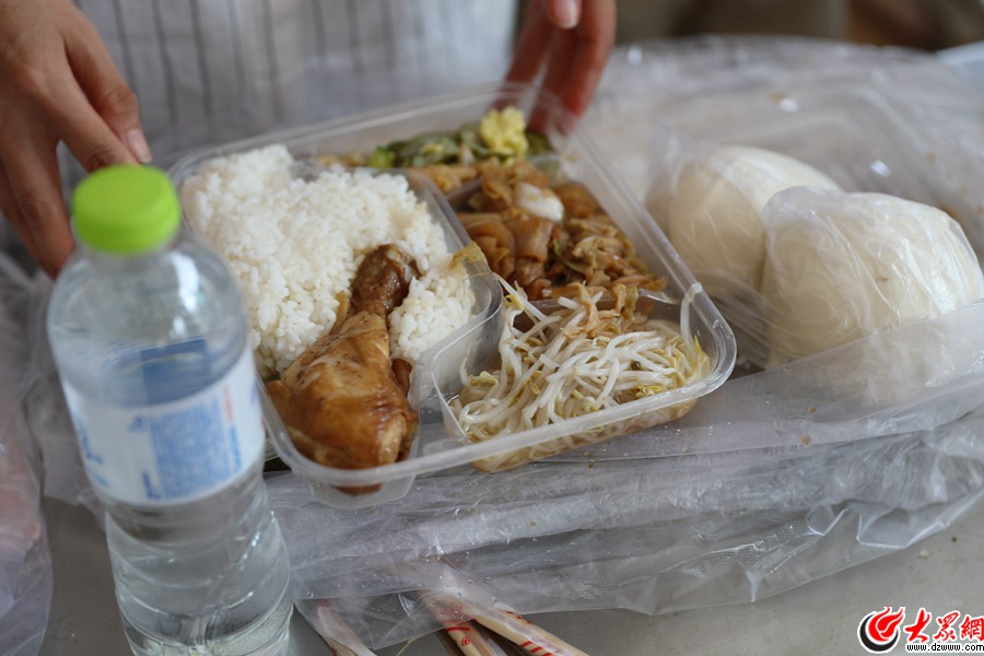 大众网潍坊8月24日讯 一人一份盒饭,两荤两素、鸡腿米饭……24日中午,记者来到寿光洪水灾区营里镇最大的一个安置点营里镇第二初级中学,恰逢安置点在分发午餐。