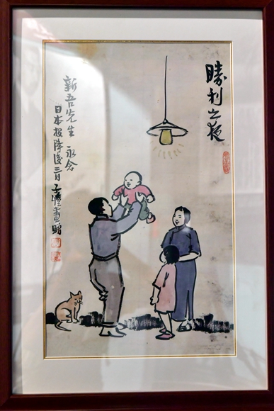 1945年8月15日,日本宣布无条件投降。三天后,丰子恺在重庆创作了这幅《胜利之夜》。丰子恺的画作本身具有非常高的价值,在这个时间创作的更显得尤为珍贵。这幅画尺幅不大,画中一家四口,父亲兴奋地高举幼子,母女在旁面露喜色,连猫眯似乎也欢伏不已,更村托出喜悦的氛围。