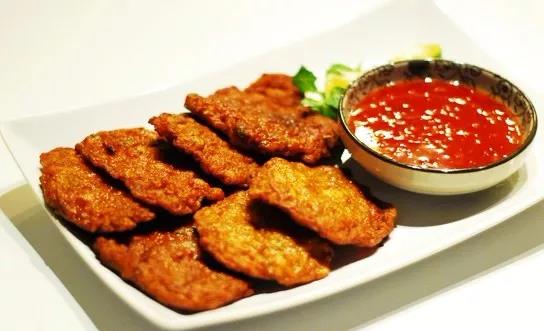 咖喱控来这简直要心花怒放~泰国咖喱鱼饼,首先将咖喱加入鱼泥、莱姆皮、小米辣、青葱、青豆一起调成鱼酱,在扒板煎出美味,再佐酸辣酱填入口中,此时的舌尖上跳起了萨瓦迪卡的圆舞曲。
