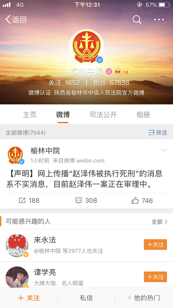 榆林市中级人民法院也于9月12日发布消息称,网上传播“赵泽伟被执行死刑”的消息系不实消息。(记者张一辰)