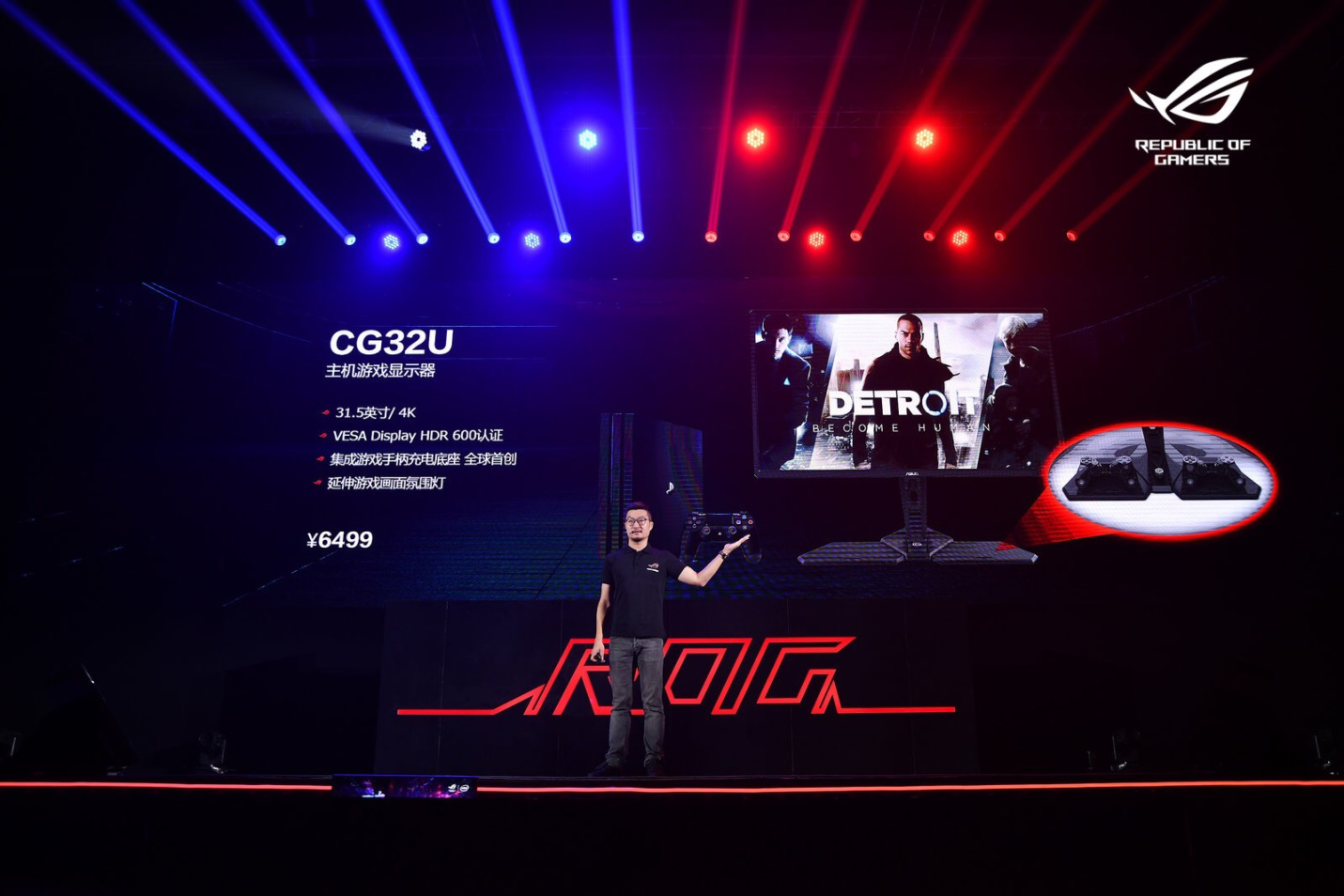 其中的CG32U电竞显示器,是ROG玩家国度针对主机游戏玩家提供的专属显示设备。CG32U电竞显示器最为令人称道的设计便是全球首创集成游戏手柄充电底座。对于玩家经常诟病的手柄放置问题,这款产品巧妙的将收纳台与底座相融合,让手柄终于也有了专属的收纳位。除此之外,CG32U 采用31.5英寸面板,提供16:9长宽比与3840×2160分辨率,拥有VESA DisplayHDR 600认证和华硕Adaptive-Sync自适应刷新率技术,可动态调节刷新率,尾部I/O扩展包括3xHDMI 2.0、1个DisplayPort 1.2、4xUSB 3.0和3.5mm耳麦插孔,集成5W喇叭。