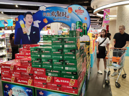 同样的火爆销售也出现在四方利群购物广场。记者发现,在广场负一楼的大厅,啤酒消费区与月饼礼盒各占据了半壁江山。“早在8月份我们就将青岛啤酒单独摆放在商超显眼位置了,中秋临近,商场内啤酒的销量起码是平时的3-4倍。”孙伟告诉记者,当前商超内,国内外啤酒品牌众多,越来越多进口啤酒登上商超货架,但最受欢迎的仍是青岛啤酒,尤其是中秋、春节等特定的节假日,青岛啤酒全品类销量都非常可观。
