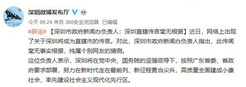 原标题:深圳市政府新闻办负责人:深圳直辖传言毫无根据