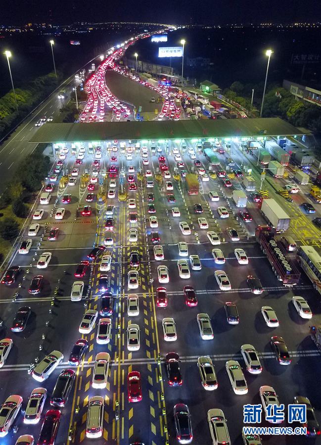 9月30日晚7时许,位于江苏省常熟市的沈海高速苏通大桥南收费站附近排起绵延数公里的汽车长龙。当日是国庆假期前一天,各地陆续迎来出行高峰。新华社发(金汉昕 摄)