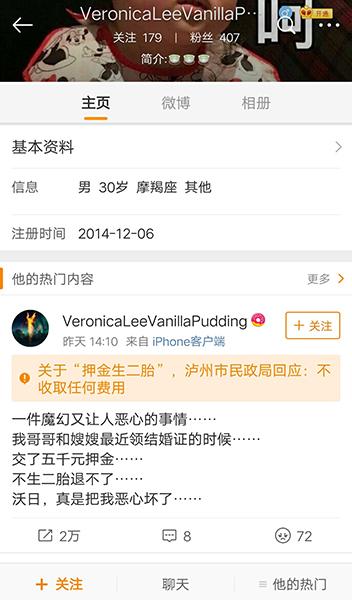 6日,微博出现一条“领结婚证要交5000元押金,不生二胎退不了……”的消息,在网络上很快引起轩然大波。截止7日中午,该微博转发量已经超2万次。虽然该微博没点名是哪个地区,但发微博网友在评论中点名“泸州主城区”。7日中午,泸州警方官方微博“平安泸州”辟谣,该网友也发表道歉说明:“我错了,我不应该听到闲话家常就随便放网上……”目前,泸州警方还在对该事件进行调查,将尽快公布处理结果。