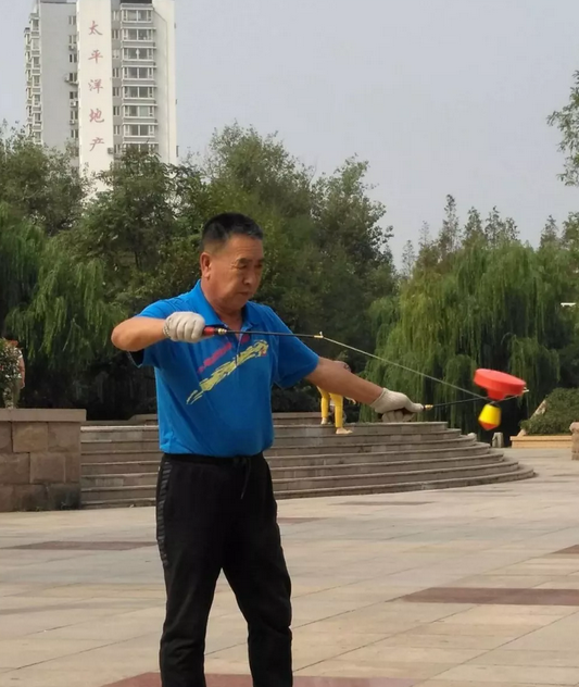 恰逢国庆佳节,老朋友见面分外高兴,新朋友相见也是一见如故,在欢快愉悦的氛围中展开了交流,各式宝贝一一登场——空竹龙头阵飞舞,长的、短的、单龙、双龙、片龙、龙凤等,长杆舞龙比较新颖,光龙身就达20米长,杆长近10米,挥舞起来气势如虹,特别威武霸气,舞者兴致所致,在长杆上又挂起了双龙,甚是好看!好奇的队员们踊跃尝试,也来体验一下驾驭威龙的感觉,大呼过瘾!而空竹龙除了一般的玩法,王洪山老师还独创了一种垂直舞龙玩法,随着空竹头的带动,整个一条龙垂直围绕在身体周围,像是把人整个包围在里面保护起来一样,煞是有气势!据王老师讲,一个空竹最多有挂九条龙的,那一身功夫甚是了得!