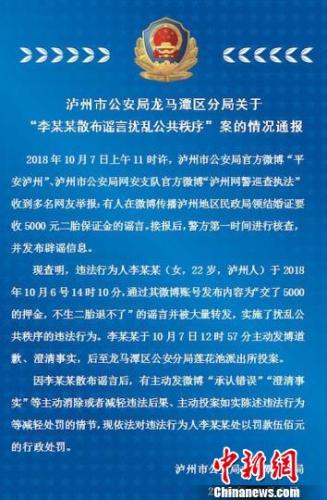 现查明,违法行为人李某某(女,22岁,泸州人)于2018年10月6号14时10分,通过其微博账号发布内容“交了5000的押金,不生二胎退不了”的谣言并被大量转发,实施了扰乱公共秩序的违法行为。李某某于10月7日12时57分主动发博道歉、澄清事实,后至龙马潭区公安分局莲花池派出所投案。