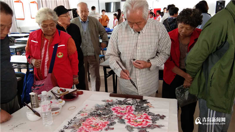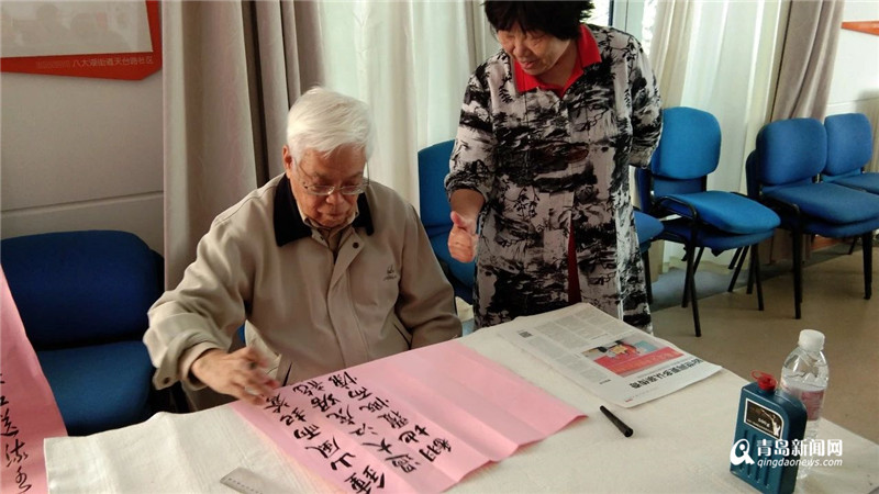 今天,社区请来了近四十位老年人和十位新昌路小学的孩子们一起,欢庆传统佳节。除此之外,这还是一个值得纪念的日子。八年前,在耿浩等六名老艺术家的倡议下,宣传栏“天台路社区居民作品选”正式与大家见面。八年期间,“居民作品选”专栏坚持每月更新,现已出刊100期,累计刊登作品1442篇。在今天的活动中,耿浩、孙传禔、王汝亮、刘德祥这四位德高望重的老人,也来到了现场,泼墨助兴。社区主任臧慧玲对社区宣传作出贡献的武尔可和四位老人献上鲜花和礼物表示了感谢,并祝重阳节快乐。最后,新昌路小学的孩子们表演的手语歌《有你的地方是天堂》给老年人送去了温暖和快乐,传承了尊老爱老的厚重内涵。