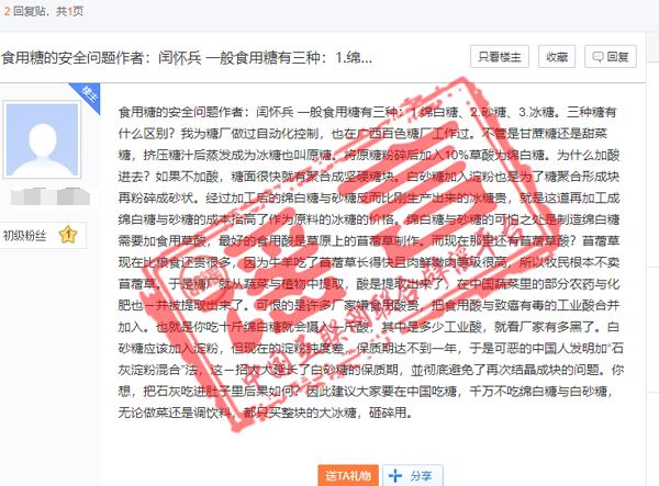 “白砂糖里加入了‘石灰淀粉混合物’,吃白砂糖等于把石灰吃进肚子里。”