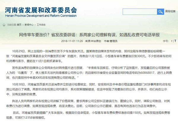 10月30日,河南省发改委关注该消息并立即进行检查核实,同时,安排郑州及中牟县价格监督检查部门对涉事两家机动车检测公司进行了调查。两家机动车检测公司均表示,系对政策理解错误,在店中张贴了将要涨价的公示,并表示,他们尚在公示中,没有实施新的收费。