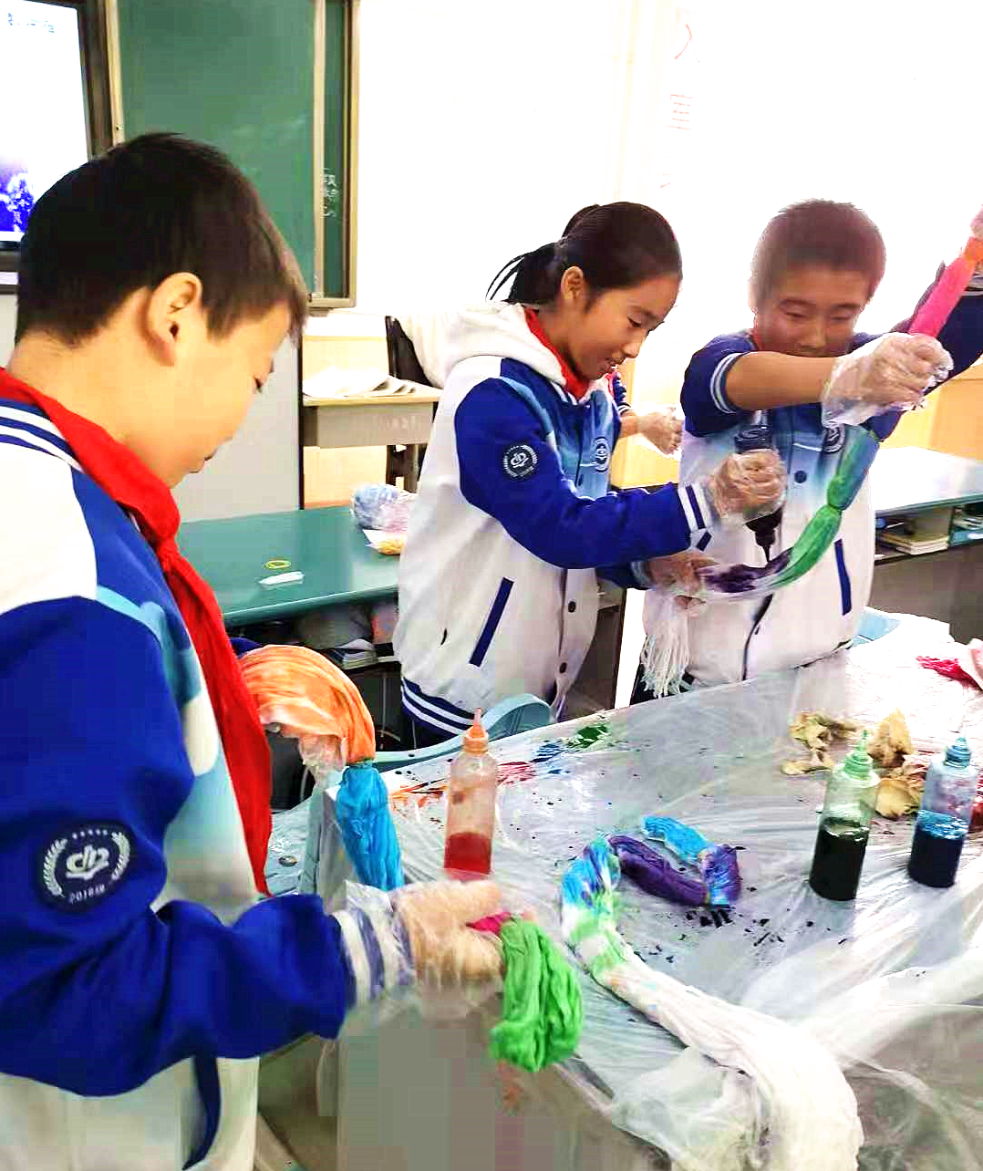 作为一所农村初中,城阳第十一中学鲜有机会接触到此类活动。学生们先通过老师的讲解学习了扎染的知识和制作过程,然后在指导老师和志愿老师的帮助下,合作开展了围巾的扎染。教室里的热烈气氛将办公室里的老师都吸引来了,来参观活动的李校长也跃跃欲试,与学生们一起动手制作了起来。制作完成的扎染围巾在校园里随风飘扬,学生们看着自己独一无二的作品,满足感油然而生。