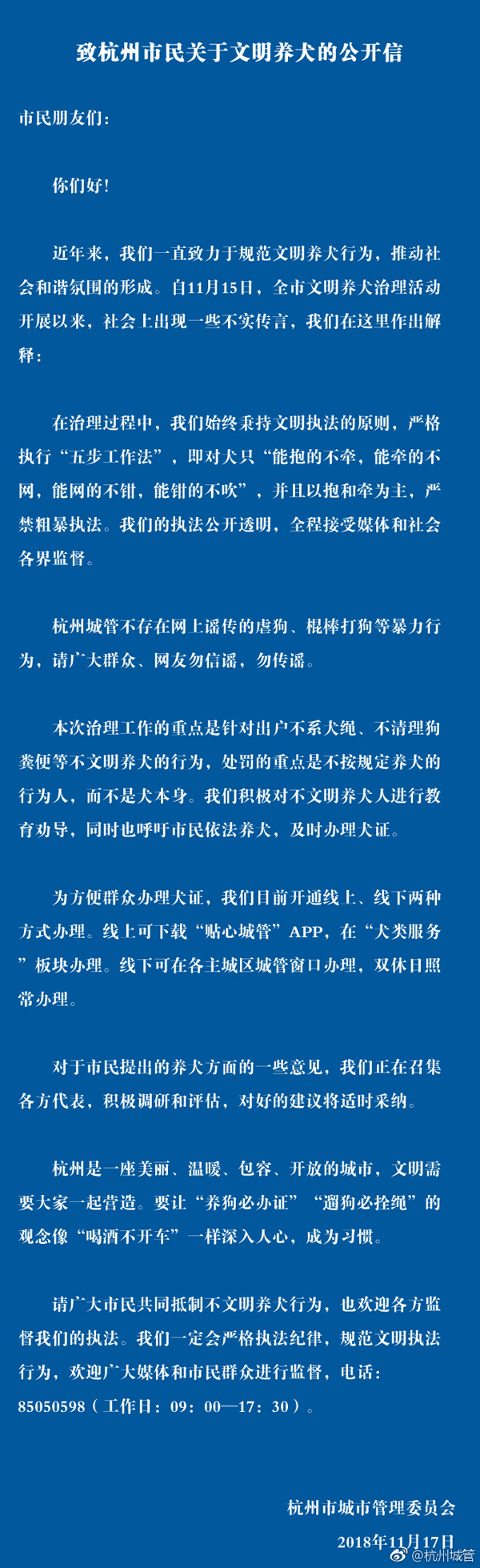 据杭州市城市管理委员会官方微博消息,杭州市城市管理委员会17日发布《致杭州市民关于文明养犬的公开信》,公开信指出,自15日全市文明养犬治理活动开展以来,社会上出现一些不实传言,杭州城管不存在网上谣传的虐狗、棍棒打狗等暴力行为,请广大群众、网友勿信遥,勿传谣。公开信表示,本次治理工作的重点是不按规定养犬的人,而不是犬本身。同时呼吁市民依法养犬,及时办理犬证。