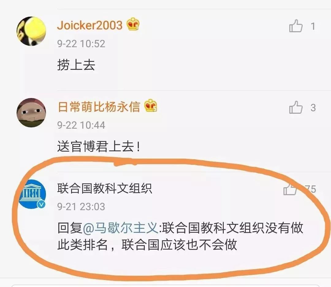 讽刺的是,“杜猛”还在微博最开始加了句“我先声明一下,可能是联合国教科文组织在造假?你忍心一下看完。”结果联合国教科文组织的官方微博当天就出来“强力打脸”,声明“联合国教科文组织没有做此类排名,联合国应该也不会做。”这条微博被多名网友举报,微博管理方最后对其做了“不实”的标记,对博主禁言15天,但这条假消息并未被删,仍然挂在那里,甚是刺眼。而作者在被处理前还接着转发了好几条贬低中国的评论。