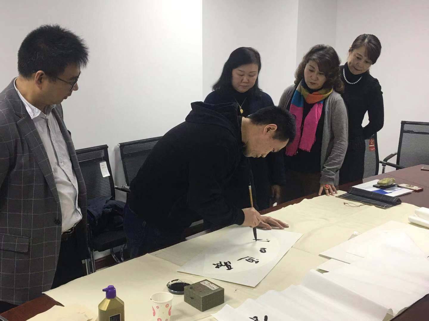 调研交流活动结束后,民进书法家孙占忠老师现场挥毫泼墨,创作了《融通四海》等书法作品,赠送给青岛世贸云商国际贸易有限公司。会员们真诚祝愿在当前经济发展的良好环境下,世贸云商国际贸易有限公司乘风而上,把企业实体做大做强,早日成为青岛进出口企业的靓丽名片。