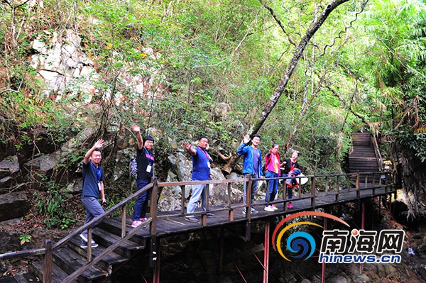 连绵不绝的霸王岭群山,掩映在一片片苍翠之中。采访团盘山而上,路旁的山涧愈发幽深,先后入情道、登霸道、寻天道,栈道旁的景观各异、特色鲜明、一步一景、浑然天成。