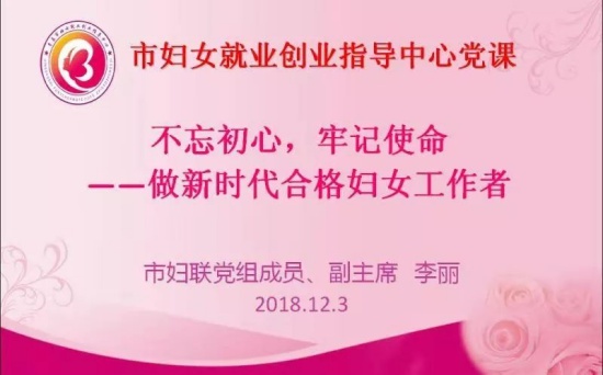 12月3日上午,市妇联党组成员、副主席李丽同志到青岛市爱心大姐服务社调研,并为市妇女就业创业指导中心党员进行了主题为“不忘初心,牢记使命——做新时代合格妇女工作者”的党课教育。此次党课进一步促进中心党员干部立足岗位做贡献的思想认识,使支部解放思想大讨论工作再提高,再升华。
