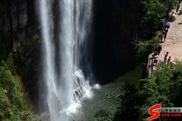 站在观瀑步梯上,记者们从不同的高度、不同的角度观看,十几丈高的瀑布如一条条彩练,直泻而下,落入深不可测的龙王潭中,水流打在石子上的水珠,如落入玉盘,清脆悦耳,引得阵阵赞叹声。