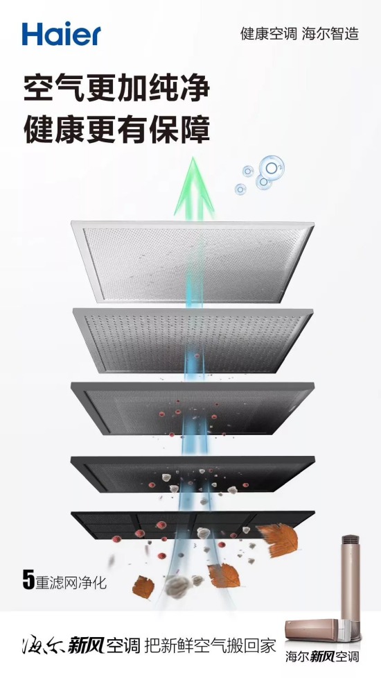 100多年来,世界空调一直采用“内循环“的出风模式,使用空调时需紧闭门窗,污浊的室内空气极易引起人体不适。海尔新风自清洁空调首创“外循环”出风,室外空气经过五重净化后进入室内,保持室内空气新鲜。