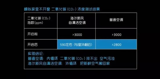 同时开启空调15分钟后,普通空调玻璃房内彩烟无变化,二氧化碳浓度依然很高;海尔新风自清洁空调玻璃房内彩烟消失,二氧化碳浓度与室外相近,实现不开窗换新空气。