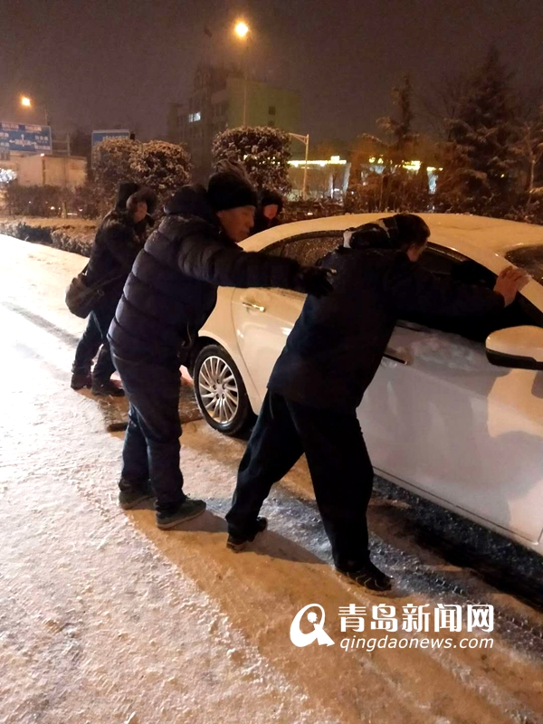 12月11日凌晨3时10分许,公交崂山巴士第四分公司突击队员来到辽阳西路与劲松一路路口撒融雪剂,发现一辆私家车熄火抛锚,由于地势陡峭,怕有溜车危险,突击队员黄剑、关冬冬带着其他队员化身“推车夫”。