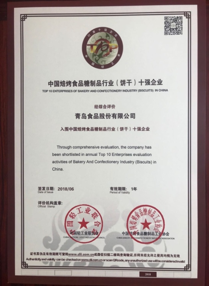 12月19日,2018年中焙糖协饼干专业委员会理事会暨行业年会于河南郑州隆重召开。会上,发布了“中国焙烤食品糖制品行业(饼干)十强企业”评价结果,青岛食品股份有限公司再次入围,连续多年蝉联此项荣誉,也是山东省唯一入围企业,以骄人的业绩成为中国轻工行业新的榜样。