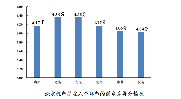 五类家电产品的综合满意度得分依次为:彩电(4.38分)、热水器(4.31分)、空调(4.31分)、洗衣机(4.27分)、冰箱/冰柜(4.26分)。对比来看,彩电产品售后服务的综合满意度得分居首,而洗衣机和冰箱/冰柜产品售后服务的综合满意度排名靠后。