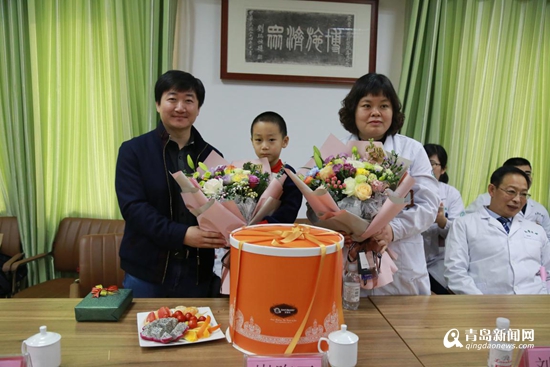 山东大学齐鲁医院(青岛)接诊的第一位住院病人前来医院祝贺。
