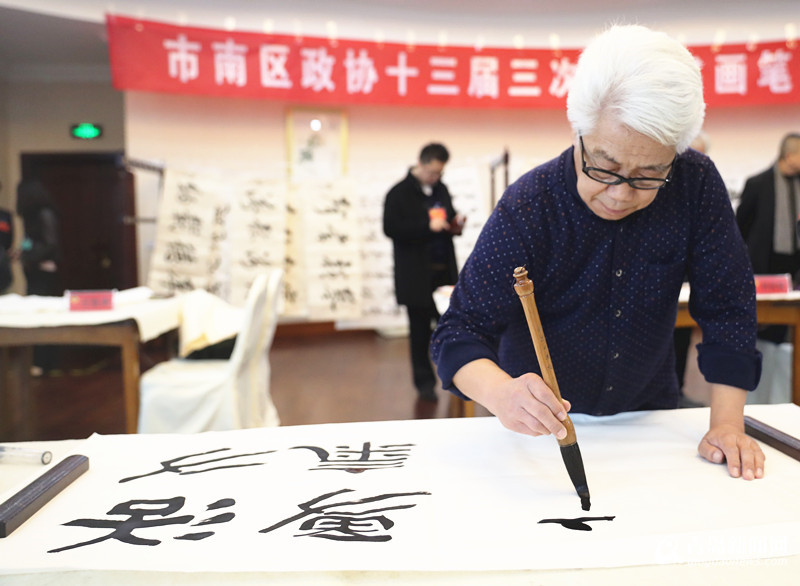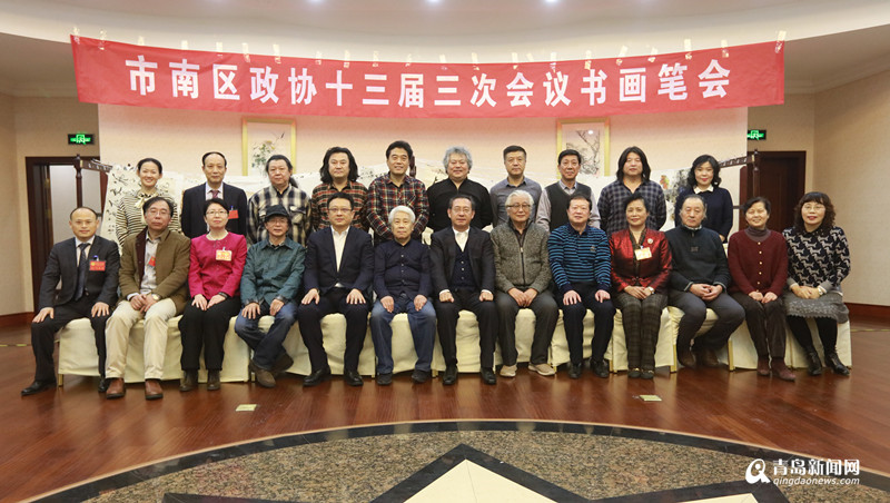 青岛新闻网1月10日讯 1月10日下午,市南区政协十三届三次会议书画笔会在八大关宾馆举行,来自市南政协书画艺术名家联谊会的刘世骏、王祖荣、靳元浩、高东方、邵世慧、王卫宁、赵善亭、单明波、郝麒、王勇、薛波、单继宏、臧崇梁等十三位书画家挥毫泼墨,现场创作47幅精美的书画作品,祝贺区政协十三届三次会议胜利召开。市南区委书记华玉松,区委副书记、区政府区长高健,区政协主席任宝光等领导现场看望书画家。