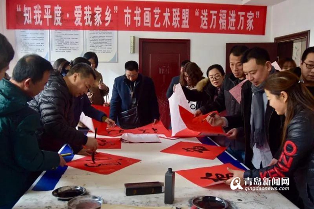 青岛新闻网1月10日讯(通讯员 綦亚克)为深入学习贯彻习近平新时代中国特色社会主义思想和党的十九大精神,助推我市开展的新时代文明实践暨“知我平度。爱我家乡”主题教育活动,“元旦、春节”两节期间市书画艺术联盟在全市范围内广泛开展“新春送温暖万福进万家”志愿服务公益活动。