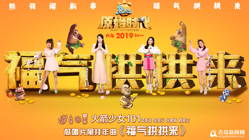 青岛新闻网1月15日讯(记者张力伟)定档2月5日大年初一上映的《熊出没》第六部大电影《熊出没·原始时代》,今日曝光由火箭少女101演唱的新年第一拜年神曲《福气拱拱来》,同时发布歌曲音频及MV。组合成员孟美岐、吴宣仪、段奥娟、赖美云分别为快乐、福气、健康、财运“代言”,向观众拜年。《熊出没·原始时代》将于大年初一2D、3D同步上映,火箭少女101将携手全新《熊出没·原始时代》拜年片尾曲,与观众一同迎接2019年春节的到来。