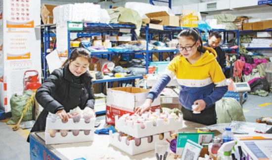 在四川阿坝藏族羌族自治州小金县电子商务产业园内, 工作人员正在为电商平台包装商品。