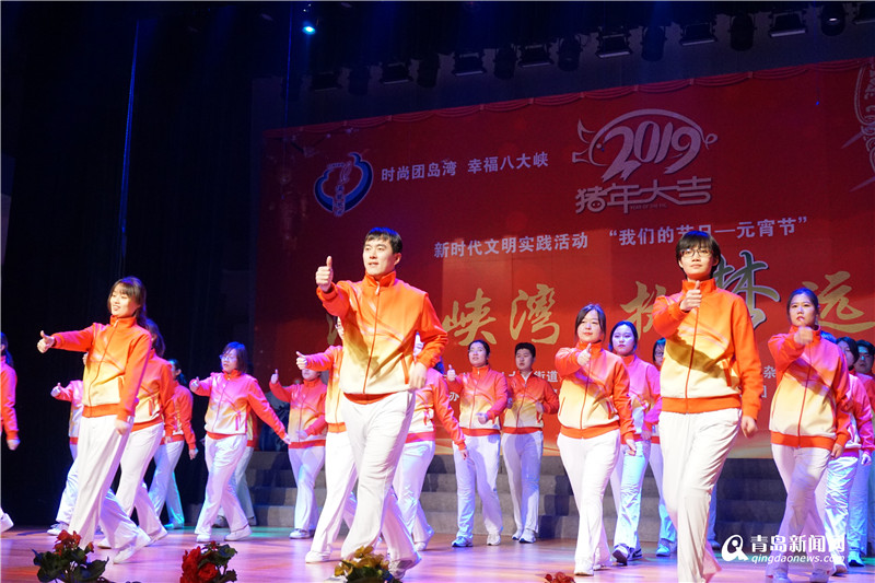 演出在社区工作人员带来的一支活力十足的《美丽中国唱起来》舞蹈中开场。由社区主任们带来的诗朗诵《夸夸咱们的好社区》,用美好的诗句总结了过一年的社区工作和新的一年充满干劲儿的激情。青岛市戏剧家协会带来的《红云岗》让辖区戏迷连连叫好,赢得观众喝彩。青岛市杂技家协会葛成栋老师的《变脸》,一张张的脸谱变化莫测的演绎手法,使观众叹为观止;孙永芬、陈丽两位老师的魔术别出心裁,深受观众好评。驻街单位双星名人集团带来的时装秀《潇洒走世界》则向观众展现了百年双星的企业文化和双星人昂扬的精神风貌。