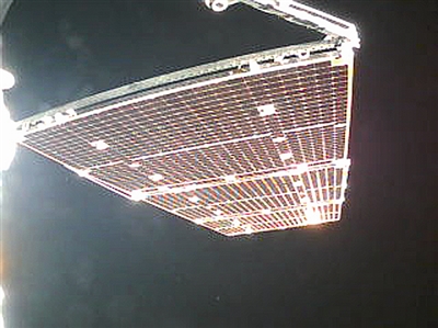 太阳帆板展开后,卫星传回的太阳帆板监视相机拍摄画面。