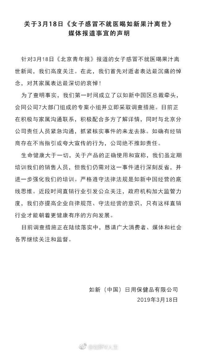 3月18日,媒体报道“女子感冒不就医喝如新果汁离世”一事引发关注。18日晚,如新(中国)日用保健品有限公司(以下简称“如新”)向南方+发来声明。如新在声明中表示,第一时间成立以如新中国区总裁牵头,会同公司7大部门组成的专案小组并立即采取调查措施,目前正在积极与家属沟通,配合多方了解详情,如果核实经销商确实存在不当指引或夸大宣传的行为,如新方面绝不推卸责任。