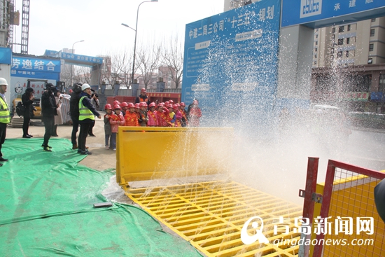 还没来到工地现场,小记者们远远就看到工地门前的主路上都撒了水,青岛融创都会中心项目施工方中建二局第三建筑工程有限公司樊经理告诉小记者们,通过洒水可以有效减轻进出车辆道路扬尘的排放。走到工地门口,小记者们发现施工现场场界修建有高高的围挡,封闭施工现场,樊经理介绍,除了这些围挡,在建筑周围还布置了防尘网,既能有效地防止粉尘及扬尘的污染,又起到隔声的作用。