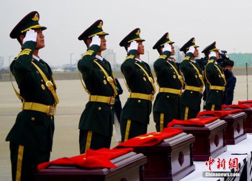 资料图:2015年3月20日,第二批在韩志愿军烈士遗骸迎接回国仪式在沈阳桃仙机场举行。(中新社发 李祥辉 摄)