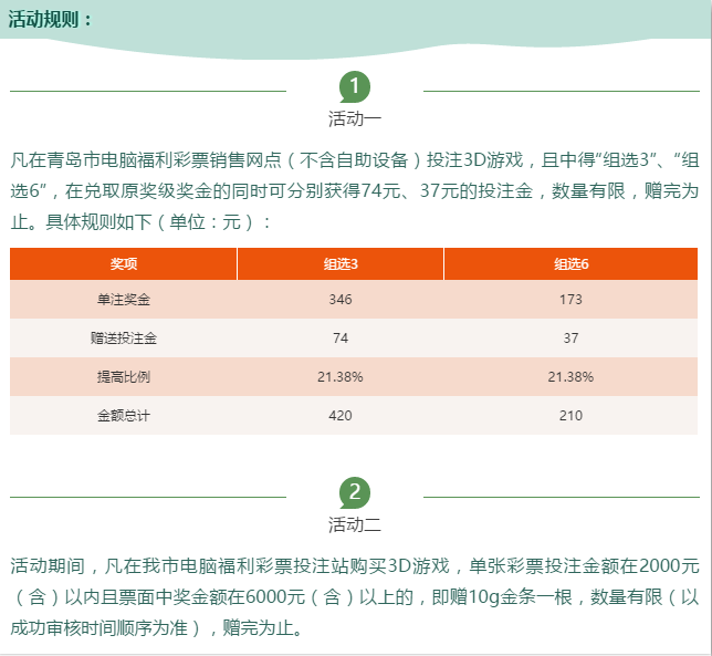 “针对本次3D活动,投注3D组选中奖率较高的这几个方法,彩民朋友们可以参考:4个号码的组6复式,价格8元,加上活动赠送的投注金,金额总计210元;3个号码的组3复式,价格12元,金额总计420元。”吴焰如是说。