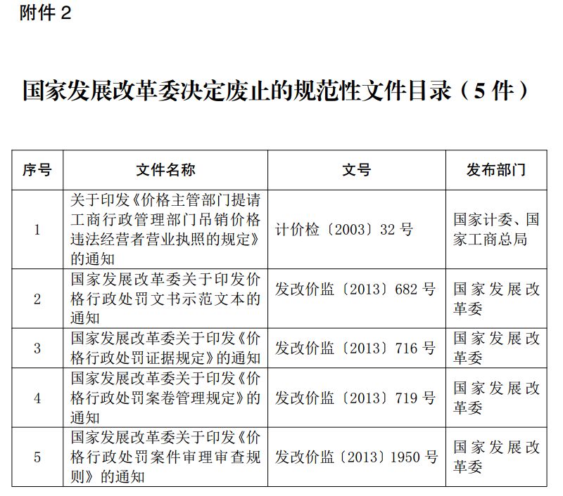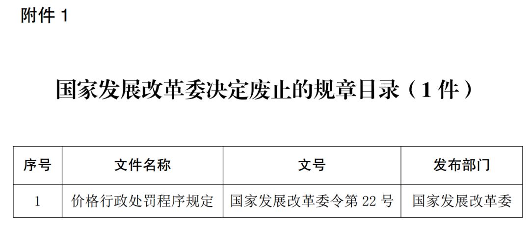 根据中央关于深化党和国家机构改革的决定和方案,价格监督检查与反垄断执法职责已从国家发展改革委划入市场监管总局。市场监管总局于2018年12月21日公布了《市场监督管理行政处罚程序暂行规定》(国家市场监督管理总局令第2号),自2019年4月1日起施行。为做好制度衔接,现决定废止《价格行政处罚程序规定》1件规章(见附件1)和《关于印发〈价格主管部门提请工商行政管理部门吊销价格违法经营者营业执照的规定〉的通知》等5件规范性文件(见附件2)。