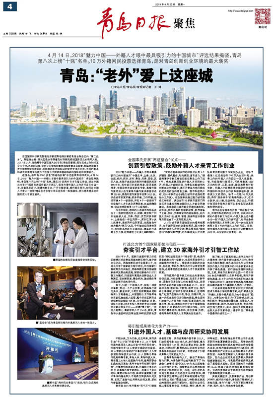 4月14日,2018“魅力中国——外籍人才眼中最具吸引力的中国城市”评选结果揭晓,青岛第八次上榜“十强”名单。10万外籍网民投票选择青岛,是对青岛创新创业环境的最大褒奖