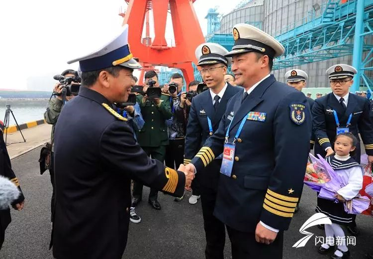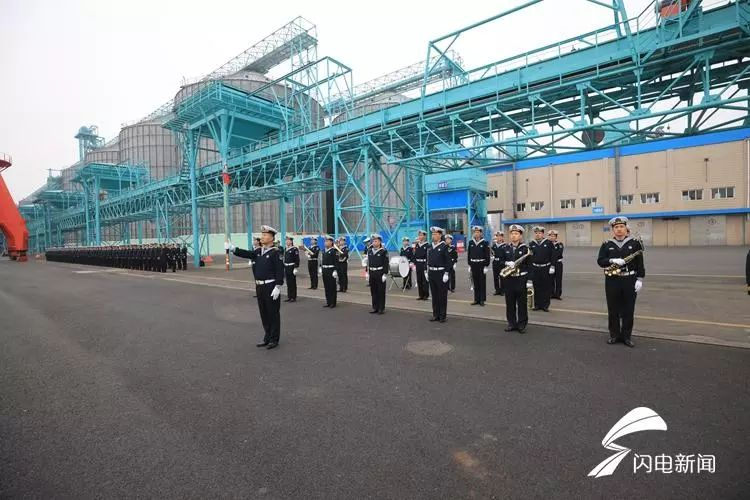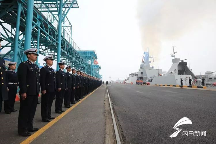 4月21日,中国海军官兵在码头迎接来访外国舰艇