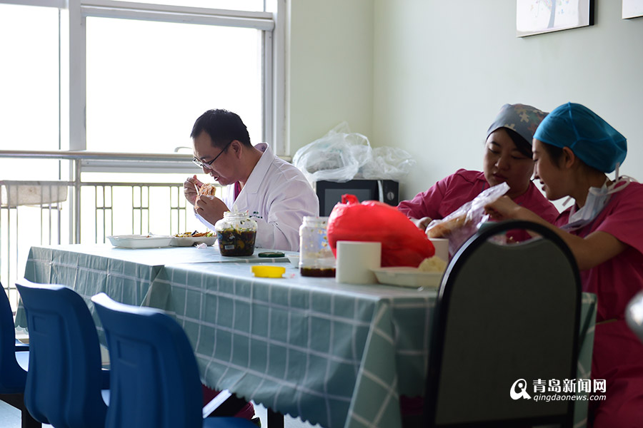 午饭时间,重症医学科就在科室的一个房间内吃饭。大家吃的是一荤两素的盒饭,还有好心的病人家属送来的咸菜。