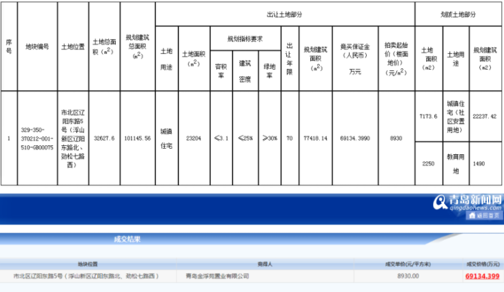 青岛新闻网5月20日讯(记者 张阿晨)5月20日上午,辽阳东路5号地块完成网上竞拍,竞得方为青岛金浮苑置业有限公司,竞得价8930元|平方米,土地总成交价款6.91亿元。