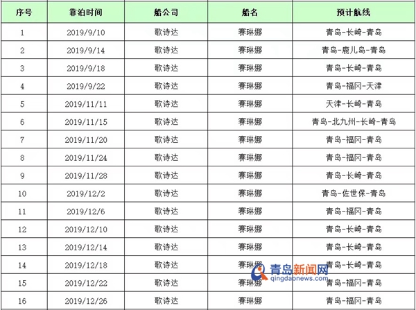 青岛新闻网5月24日讯(记者 王爽)青岛新闻网记者从邮轮旅游发展联盟获悉,有着“众神之船”之称的赛琳娜号今年下半年在青运营航线已全部公布。9月、11月、12月,将有16个班次发往日本北九州、佐世保等5个城市。其中15个班次从青岛邮轮母港出发,4晚5天的行程之后返回青岛,只有11月11日的班次是从天津港出发,最终折返至青岛。