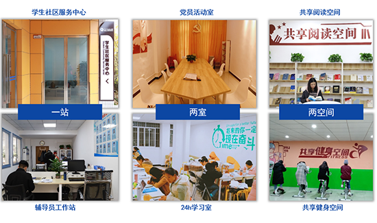 学生社区以“党员活动室”、“诚信驿站”、“SKILL+(享阅空间)”、“24h学习室”与“辅导员工作站”等平台为实际依托,实现党建、学习、交际、休闲、商务、环保六大功能。