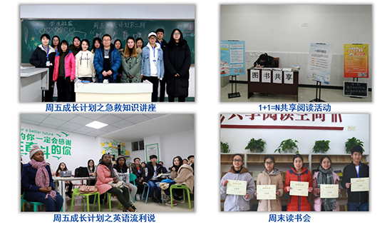 内涵建设则以文化活动为载体。社区开展共享阅读活动,通过共享改变藏书和阅读习惯,打造书香社区,并且通过开展“周末读书会”,让读书在社区蔚然成风。在“周五成长计划”活动中,同学们可以采取沙龙、座谈、观影和竞赛等喜闻乐见的形式,以学术艺术、民俗文化等为主题,将社区打造成为自主管理、行为养成、交流分享的平台。