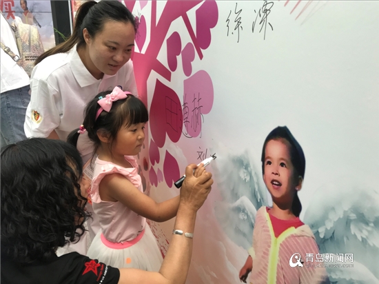 孩子在器官捐献宣传背景板上签下自己的名字。