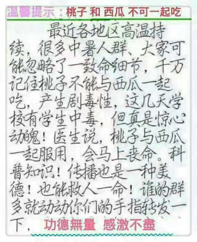 “最近各地区高温持续,很多中暑人群,大家不能忽略一个细节,千万记住桃子不能和西瓜一起吃!”这张温馨提示的截图又开始在家长群里流传。