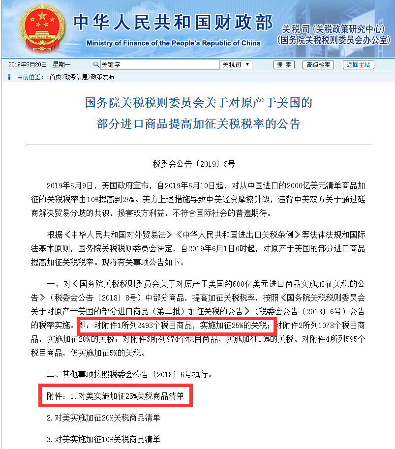 查证发现,国务院关税税则委员会5月13日发布对美商品加征关税公告。公告称,将对附件1中所列2493个商品加征25%的关税(如下图所示)。