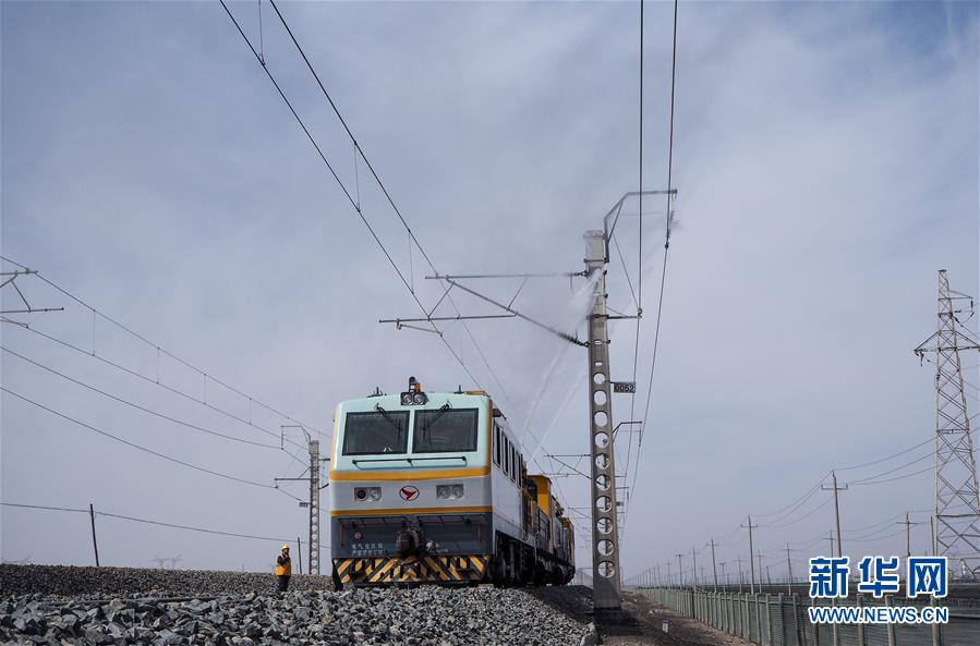 青藏铁路公司西宁供电段格尔木大修车间的接触网清洗车在清洗绝缘子(5月12日摄)。新华社记者 白玛央措 摄