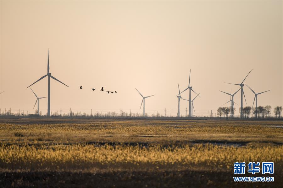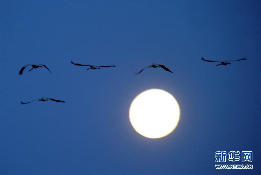 在吉林莫莫格国家级自然保护区,一群白鹤从湿地上空飞过(4月11日摄)。新华社记者 张楠 摄